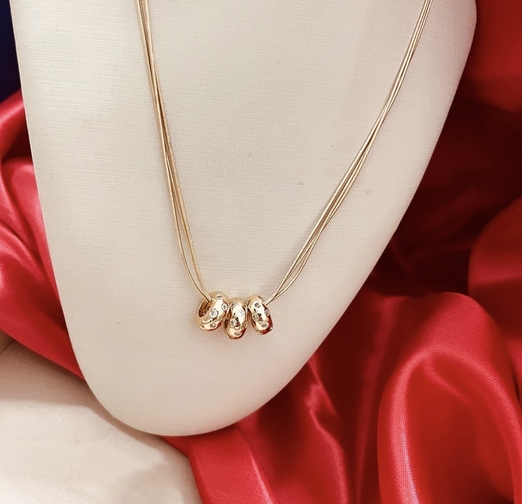 Composto por três correntes entrelaçadas, ele proporciona um efeito visual deslumbrante. Os pingentes com pontos cristal são o verdadeiro destaque, refletindo a luz e trazendo um brilho encantador que atrai todos os olhares.
